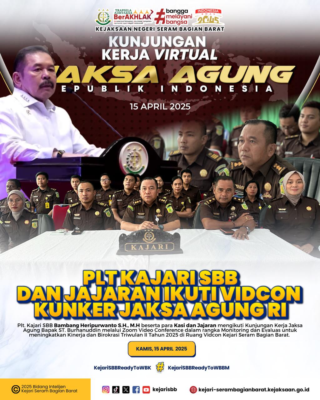 Rekayasanwes.com |Kejaksaan Negeri Seram Bagian Barat – Piru, Kamis, 15 April 2025 Plt. Kajari SBB Bambang Heripurwanto S.H., M.H beserta para Kasi, Kasubagbin dan Jajaran mengikuti kegiatan Kunjungan Kerja Virtual Jaksa Agung RI Dr. ST Burhanuddin melalui Zoom Video Conference dalam rangka untuk meningkatkan Kinerja dan Birokrasi di Triwulan II Tahun 2025 ini.